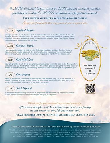 Each year between Thanksgiving and New Year?s, Coastal Hospice invites our Lower Shore neighbors to be ?angels? by including us in their holiday giving. During this time, angel ornaments, each personalized with the name of someone a donor wishes to honor or remember are displayed on Christmas trees throughout the four Lower Eastern Shore communities we serve.