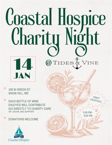 Wednesday, January 14, 2026, from 5 - 9 PM. Donations welcome for a great evening benefiting Coastal Hospice Chairty Care!