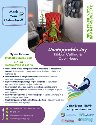 Unstoppable Joy, a nonprofit dedicated to supporting cancer warriors, their caregivers, and pets battling cancer, invites the community to an Open House and Ribbon Cutting celebration on Wednesday, December 3rd from 3:00-7:00 PM at 314 Franklin Ave, Suite #107, Berlin, MD 21811. The official ribbon cutting ceremony will take place at 4:30 PM.