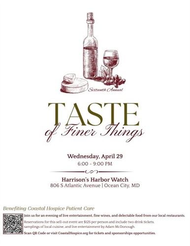 Our 16th Annual Taste of Finer Things returns to Harrison’s Harbor Watch for an evening of breathtaking views, fine wine, incredible local cuisine, live entertainment, and an exciting silent auction. All proceeds benefit Coastal Hospice patient care.